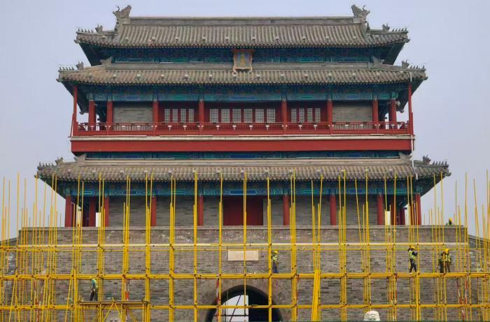 本次修缮以恢复永定门城楼历史原貌为目标,将对屋面、墙体、大木梁架、门窗装修、楼地面、台基、油饰彩画等部位进行全面修缮保护。